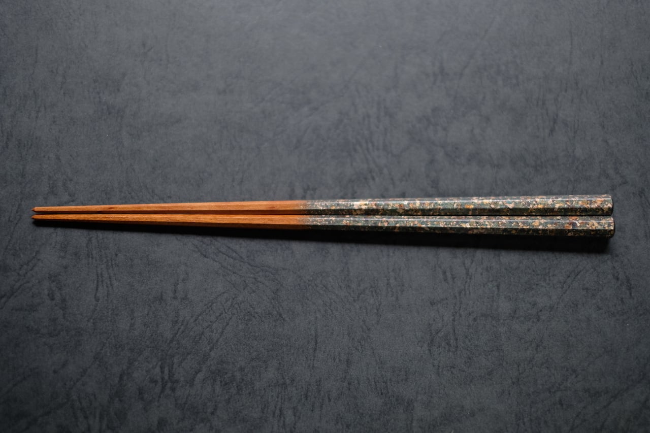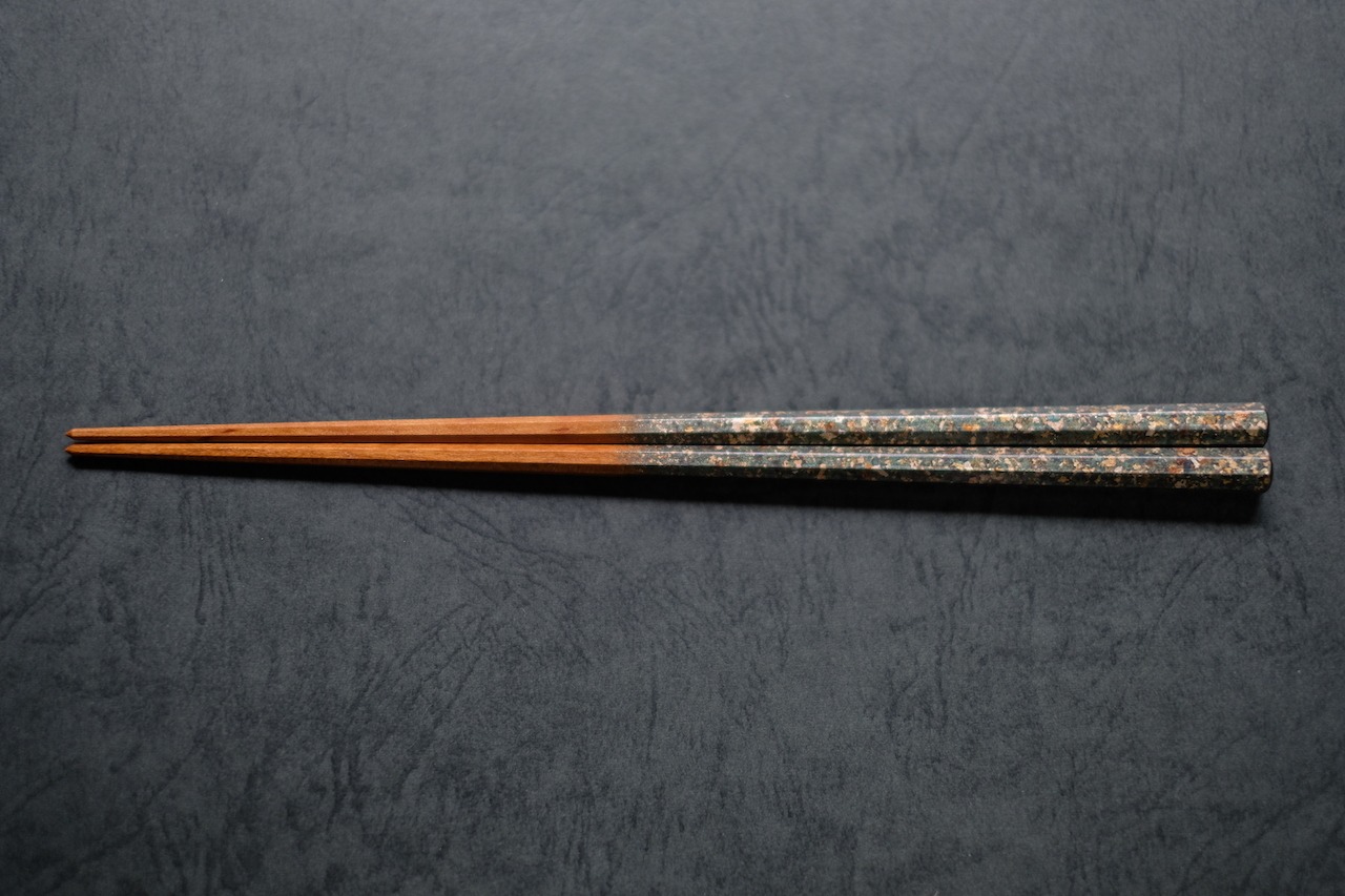 京都の伝統的工芸品「西陣織」の箔職人こだわりのお箸です。西陣織の特徴である引箔の制作技法を用いて彩色しました。大変希少性の高い箔をを使用し、箔の特徴である経年変化を楽しんで頂けます。